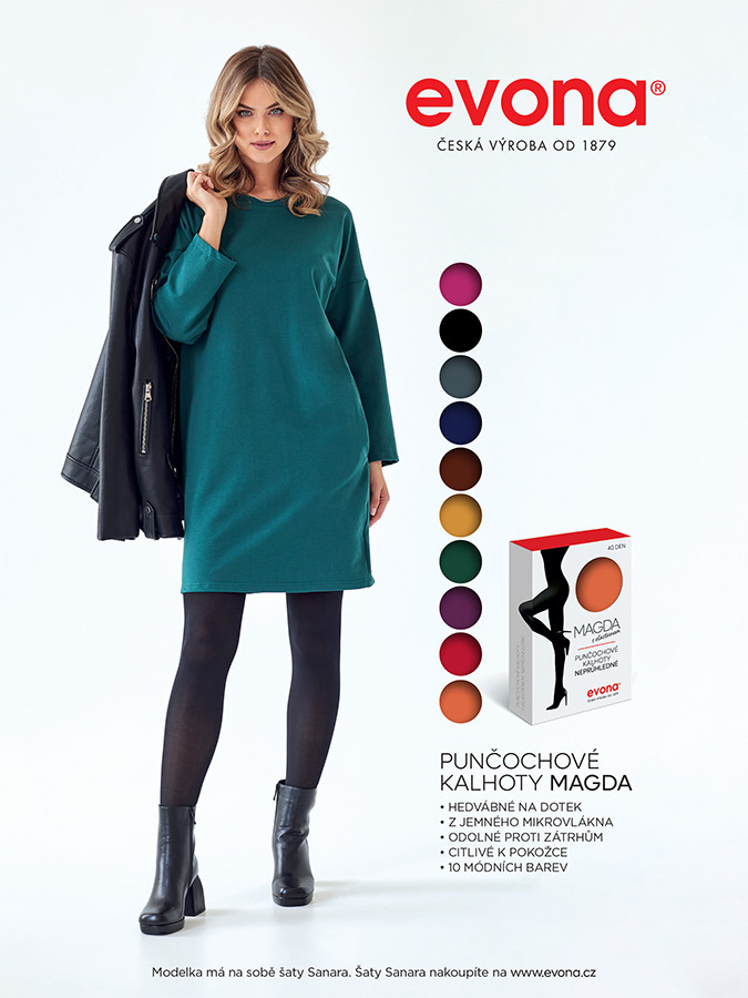 Ak doplníte tieto šaty farebnými pančuchovými nohavicami MAGDA z našej ponuky, budete neodolateľná.