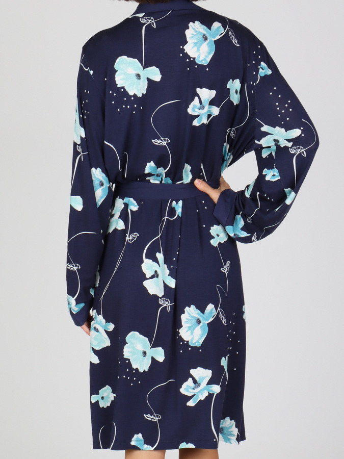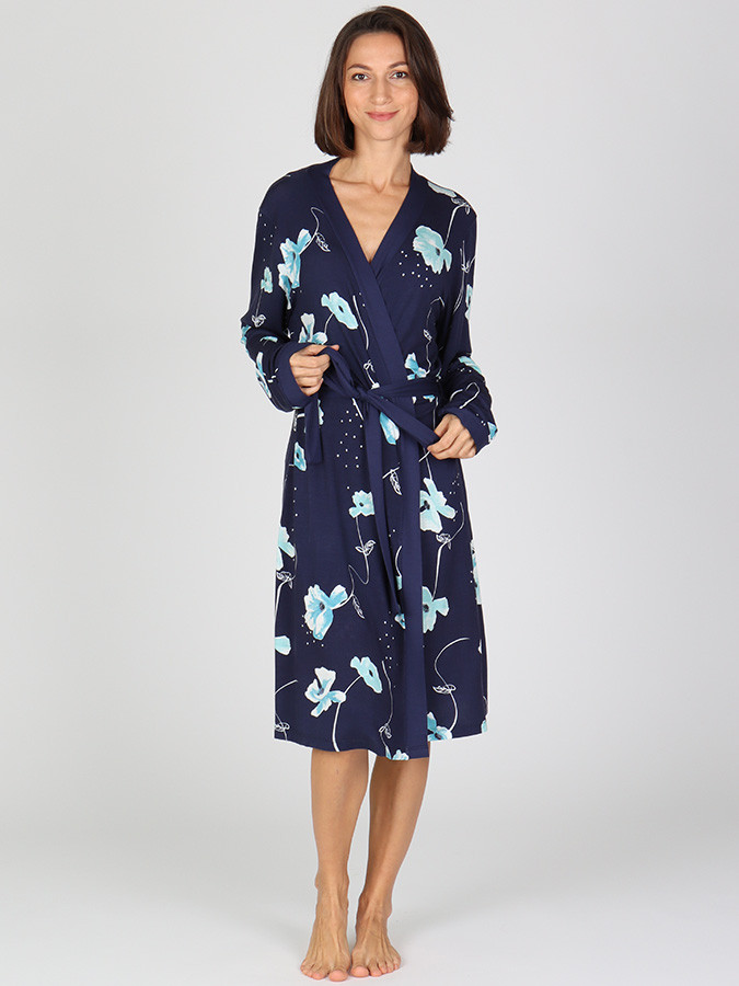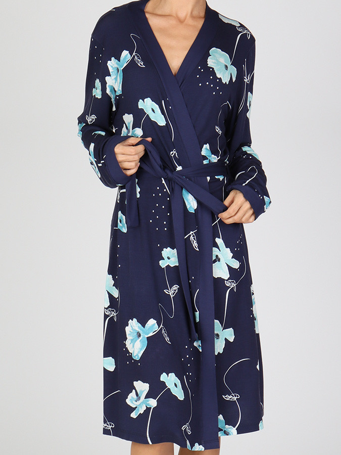 Krásny ľahký dámsky župan GIONA s jemnou potlačou kvetov je klasického zavinovaniacho strihu, kratšej dĺžky, s dlhým rukávom a viazačkou v páse. Župan je z rovnakého materiálu as rovnakou potlačou ako nočné košieľky Francis, Fergi či Naira a je tak skvelým doplnkom k týmto košieľkam.