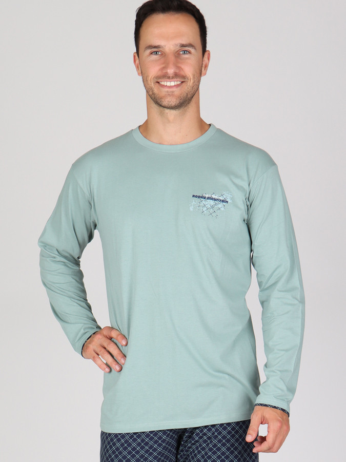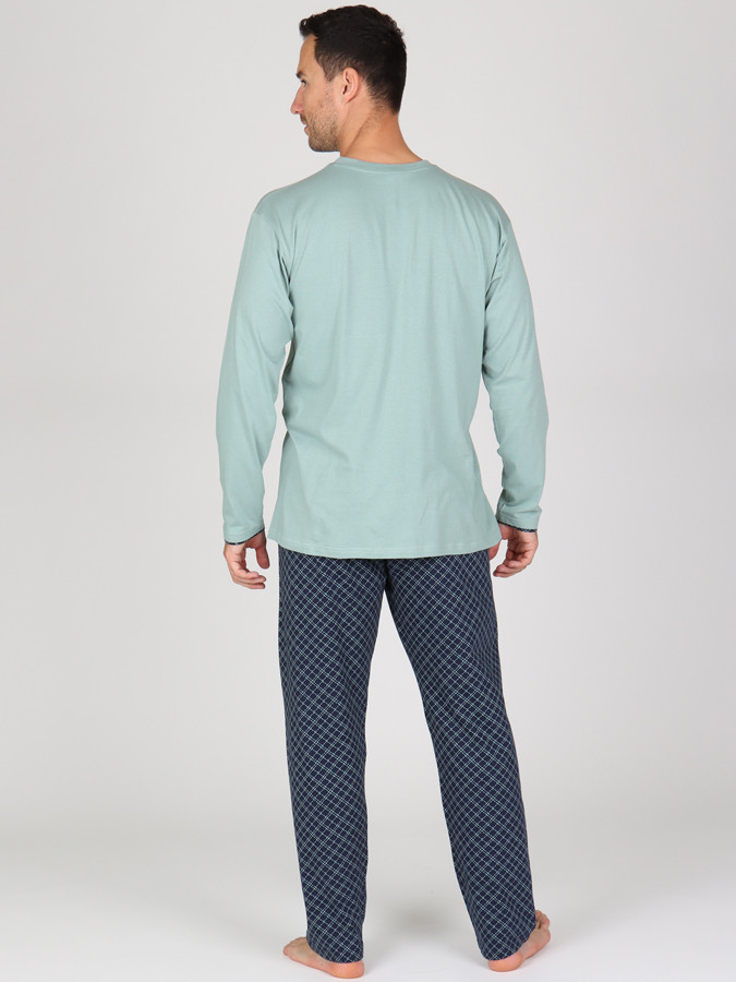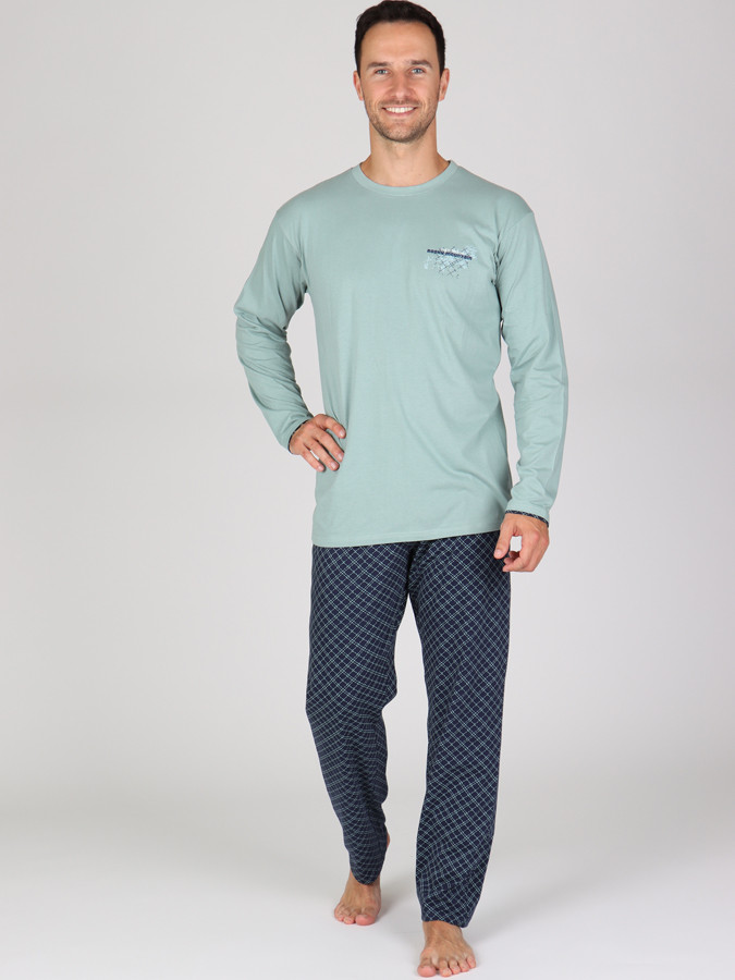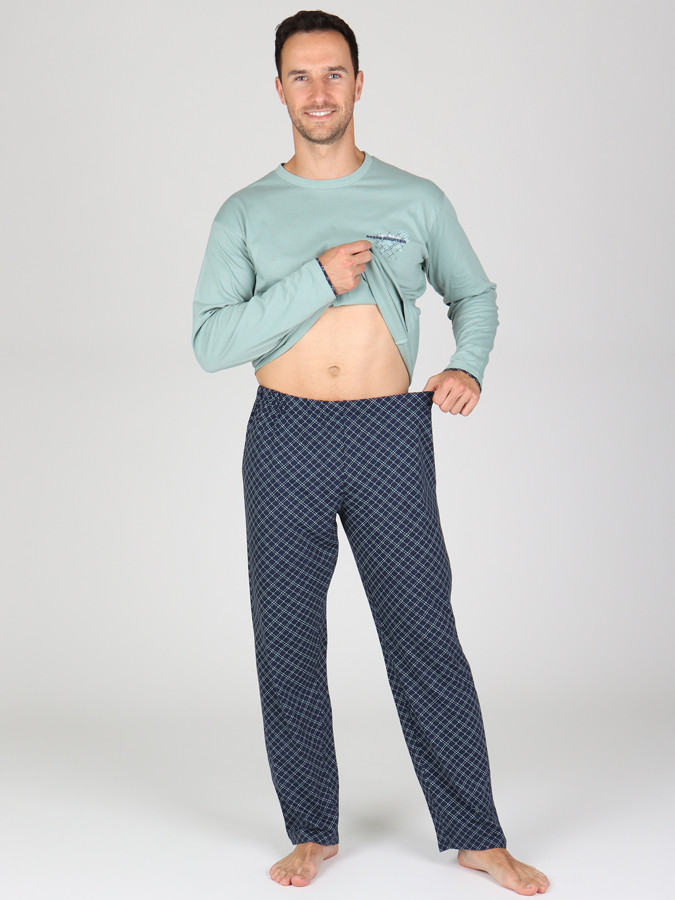 Pohodlné bavlnené pánske dlhé pyžamo sa skladá z jednofarebného trička s dlhým rukávom a z dlhých nohavíc s károvou potlačou. Tričko má na prednom diele drobnú potlač.